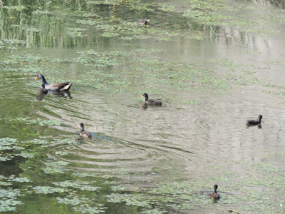 バンの親が沢山の雛を連れている、黒いごま団子みたいな雛も丈夫に育っている。