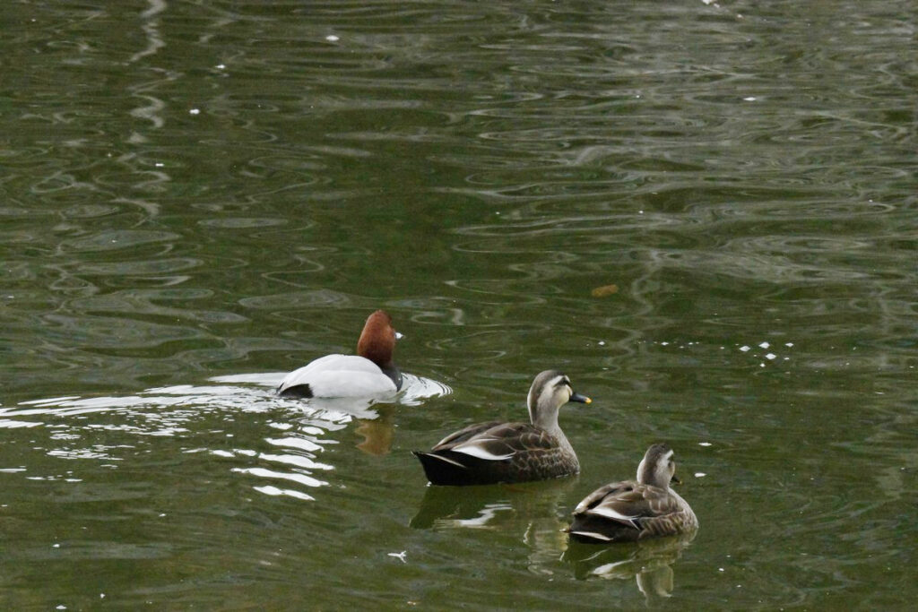On January 5, 2026, I was able to take a photo of a Common Pochard and a Spot-billed Duck side by side on the water surface. You can see the difference in their physical characteristics. The Common Pochard’s body is submerged deeper in the water than the Spot-billed Duck’s, so its tail feathers are hidden underwater. The Spot-billed Duck’s tail feathers are visible above the water’s surface. Even though they live in the same pond, they eat different foods and have different foraging methods, so they can coexist without fighting.