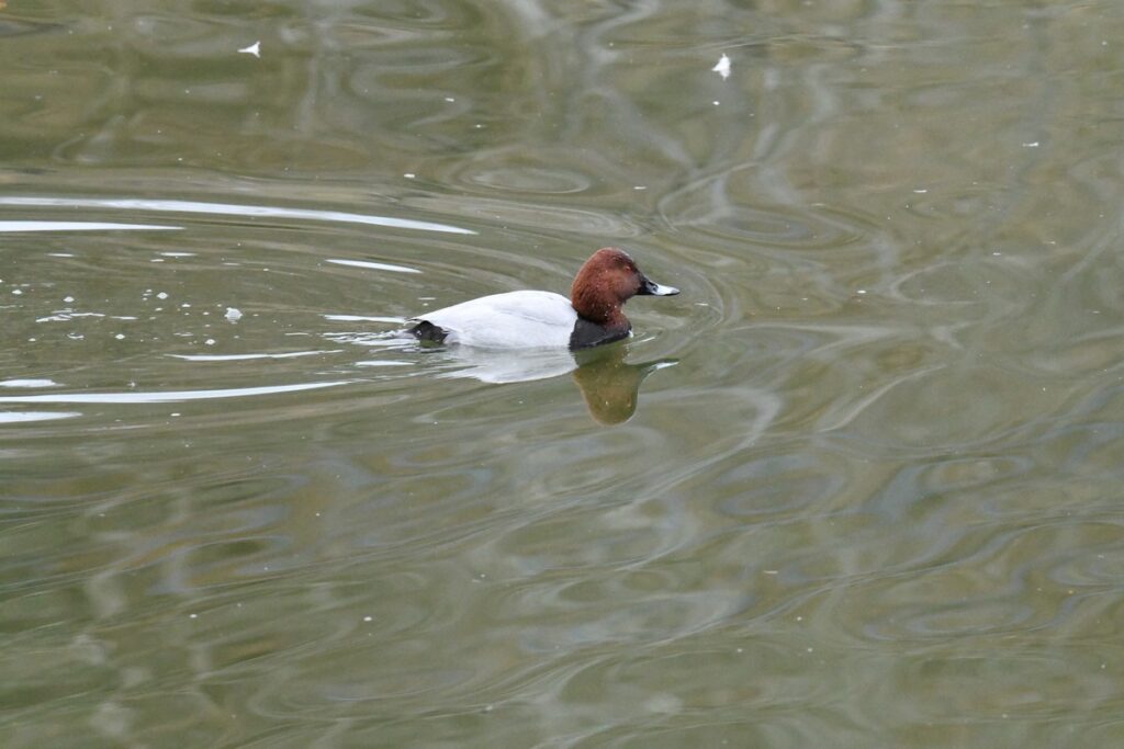 2026年1月5日、ホシハジロとカルガモを比べると体の特徴と餌の取り方が異なる。ホシハジロは潜水ガモと呼ばれる仲間なので潜水して餌をとる。マガモやカルガモなどは淡水ガモと呼ばれる仲間で水面で餌をとったり、逆立ちして水中に首を伸ばし水草を食べる。