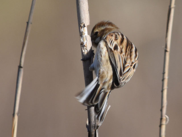 The bird perched on the stem of the reed vertically and repeated the same action. The pattern of the head of the bird resembles very much the female of Meadow bunting, but the belly is whitish.