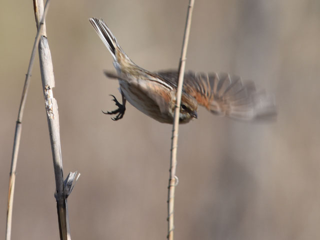 On March 25, 2016, I strolled in Kashiwanoha Park in Kashiwa city early in the morning. Two small birds flew and perched on the reed of bush in front of me when I was walking the second Kashiwanoha waterside park. They are half invisible behind the dense reed. One of the small birds moved to a different reed. Then, the bird came into full view. It is a small bird that resembles very much a female of Meadow bunting. The bird tore off the stem of the reed and having bait. This bird will be Reed bunting (female) of the bunting family from such action and the plumage. The bird flew again and moved. The torn off stem of the reed is visible. The reed bed is like a good feeding ground for them.