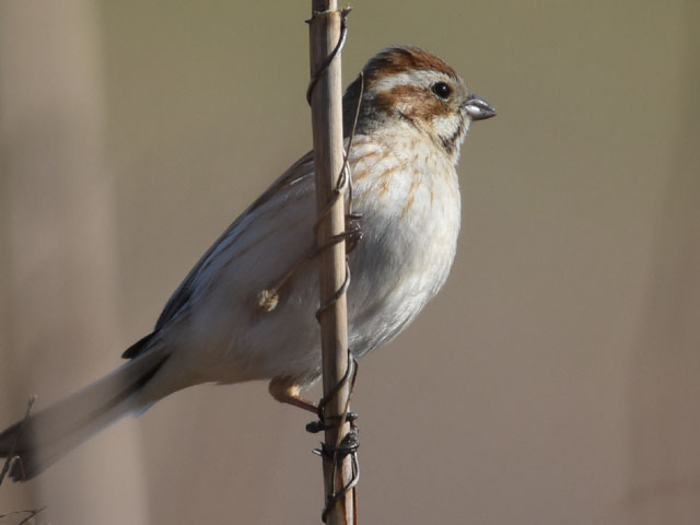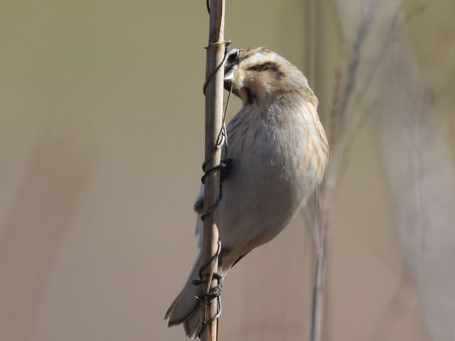 小鳥は葦の茎に縦に止まり、同じ動作を繰り返した。小鳥の顔の模様はホオジロのメスと良く似ているが、腹部は白っぽい。