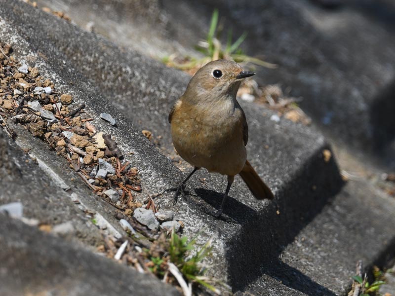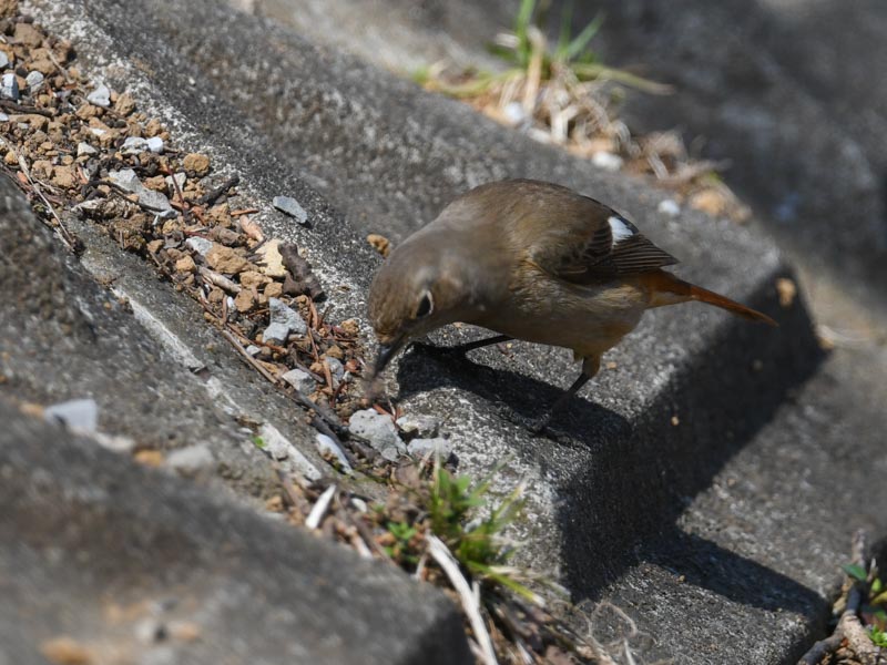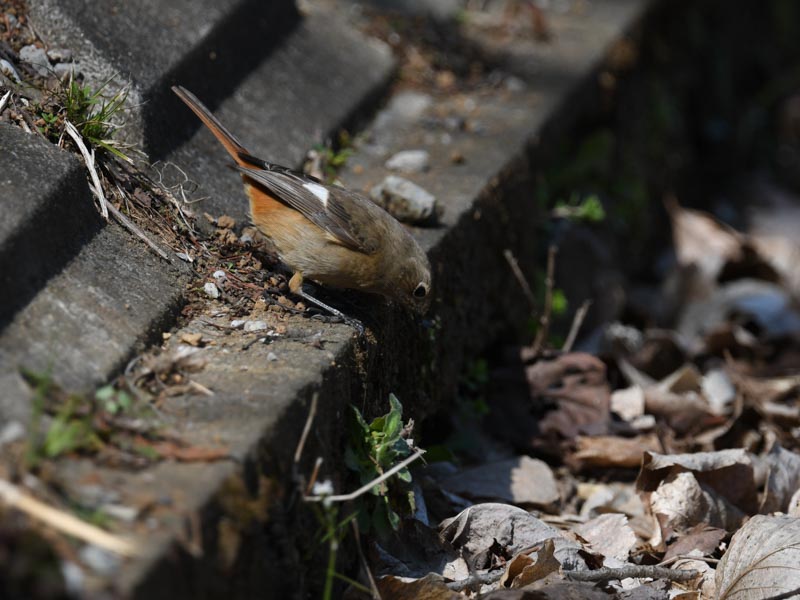 ジョウビタキは突然側溝の近くに舞い降りた。ジョウビタキは側溝をのぞいて飛び降りて虫を咥えて戻ってきた。The bird suddenly swooped down near the gutter. The bird looked into the gutter, jumped down, and returned with an insect in its mouth.
