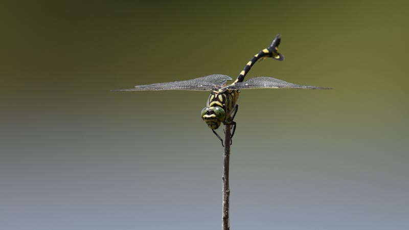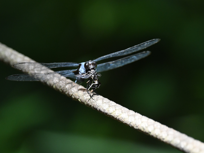While walking around Konbukuro-Pond Nature Museum Park, I saw a dragonfly (Orthetrum triangulare melania) perched on a rope. The dragonfly suddenly flew up and then came back down. I took a photo and saw that it was catching an insect. What amazing flying ability!