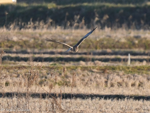 チュウヒは田の上で獲物をねらうような飛び方をした。遠いが順光状態なので羽衣の模様が分かる。 このチュウヒは全身が褐色の羽毛に覆われ、腹面は淡褐色で褐色の斑紋が入るように見えるのでメスかもしれない。