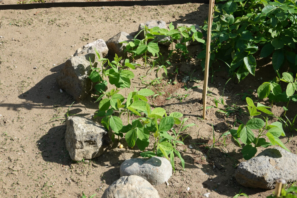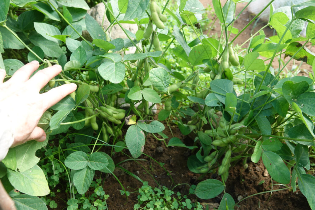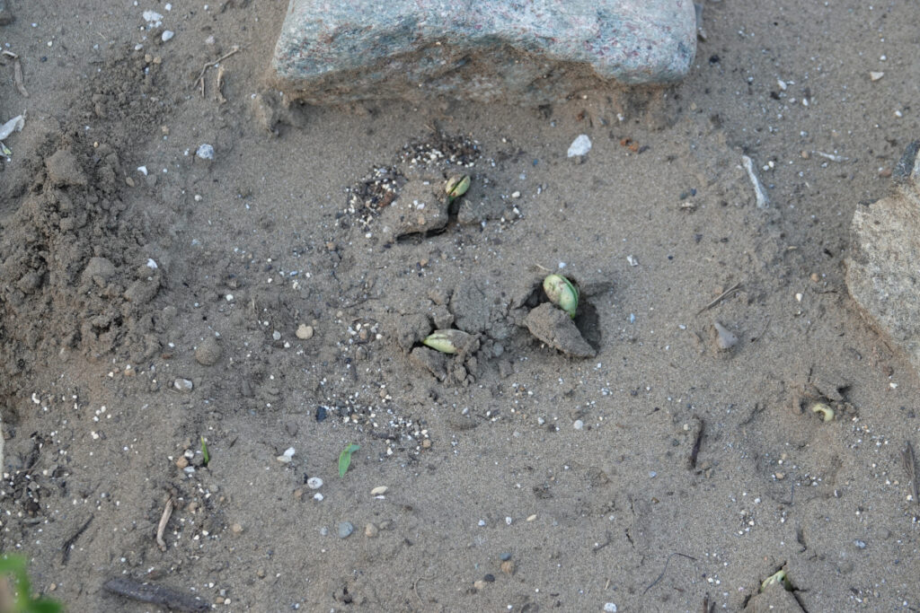 2025年5月1日、2回目の枝豆植えを行った。場所は他に邪魔にならない位置である洋ナシの周辺とキンカンの隣、全10か所であり、各場所に3粒ずつ植えた。