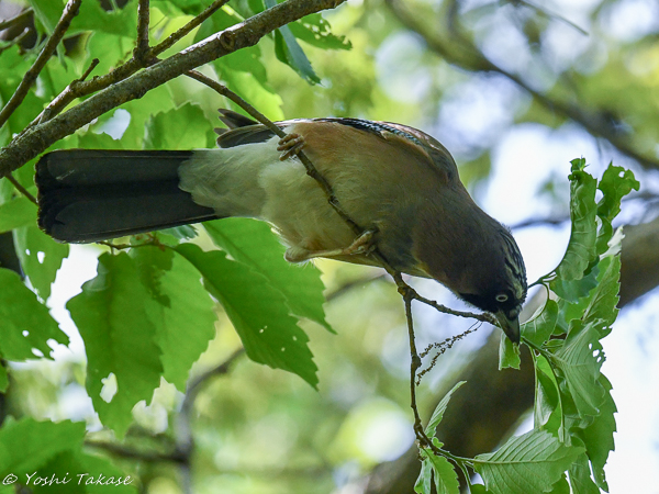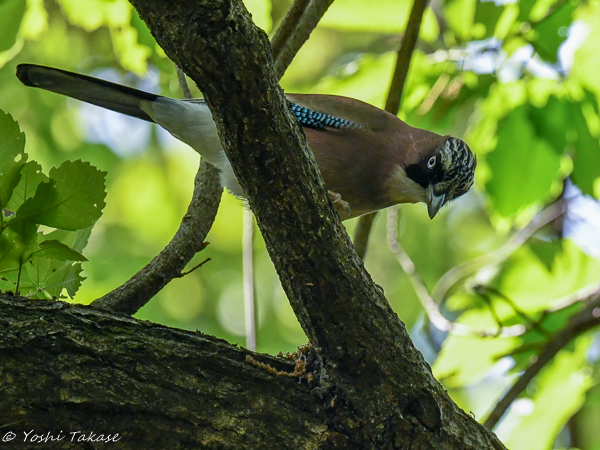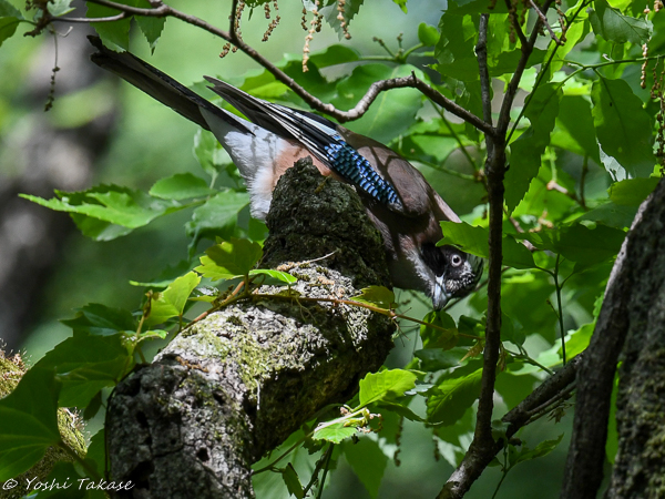 カケスはやや遠い木の枝に止まって虫を捕ろうとしているようだ。でもやはり警戒を怠らない。