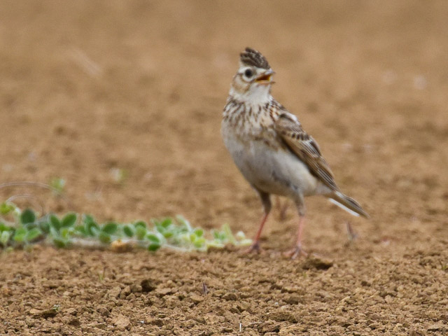 ピントがヒバリに合ったので表情も良くわかる。冠羽を立ててさえずっているのでヒバリのオスだろう。