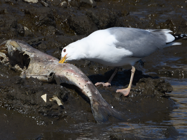 2017年3月3日、水元公園を散歩した。帰り道、中川にかかる橋を渡っているとき、岸辺で大きい魚の死体をついばんでいるカモメに気付いた。カモメの背中と翼上面は明るい灰色で、頭部、首、腹、尾は白い。くちばしは黄色く、下くちばしの先端近くに1つだけ赤い斑点があり 脚は薄いピンクだ。このような特徴からこのカモメはセグロカモメのようだ。魚は随分大きい。ハクレンだろうか?