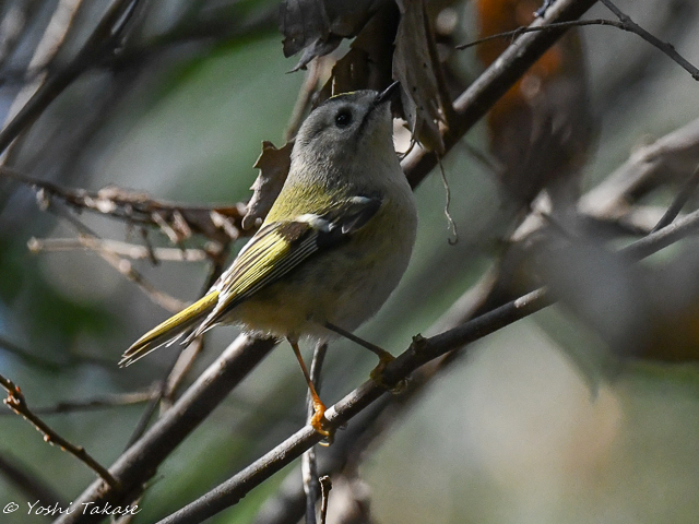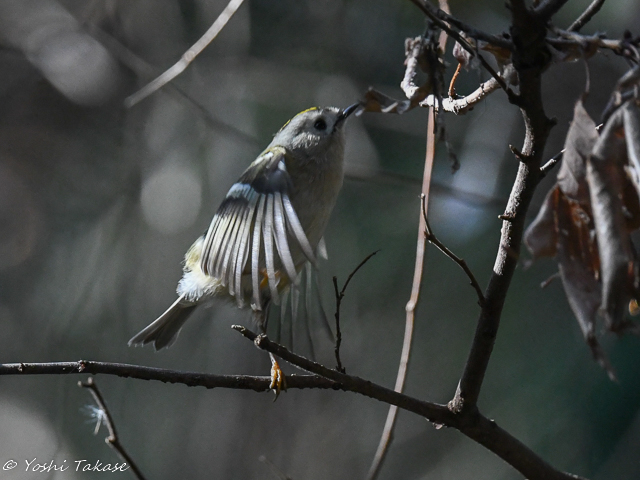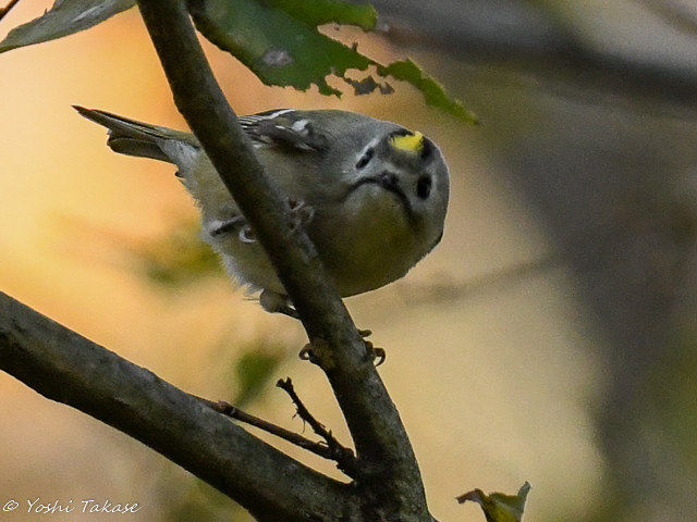 キクイタダキはまた別の枝に移動した。キクイタダキは珍しく正面を向いた、しかし遠いのでカメラをにらんでいるのではない。