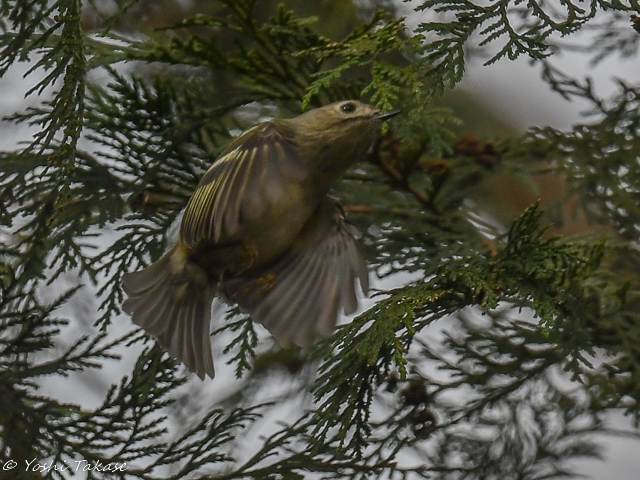 小さい体を生かし小枝の葉に付く虫をホバリング捕食し他の小鳥とうまくすみ分けているキクイタダキ, Goldcrest successfully differentiating itself from other birds by hovering to prey on insects on the leaves of twigs making the best use of the small body.