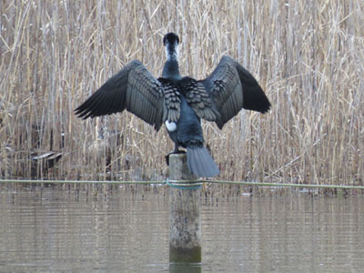 池で餌を獲っていたカワウが杭に登って羽を干している、頸と胴の一部が白くなり見事な婚姻色だ(千葉県 2012/12/21 15:16, 15:19)