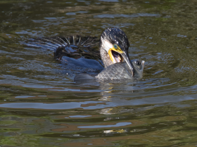 結局、カワウはヘラブナが大きすぎて食べるのを諦めた。カワウやウミウは大きい魚もどん欲に捕まえる。人間は古くからこの習性に注目して魚とりを行った。