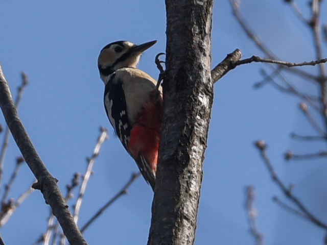 On Apr. 4, 2017, I strolled in Konbukuro-Pond Natural History Park. I saw a Great spotted woodpecker perched on the branch of the tree around the small grassy plain. The woodpecker soon moved to a different tree. The woodpecker was looking for food by walking on the tree trunk, but the tree was rather high, so its appearance was difficult to see. The woodpecker moved to another tree again. Somewhat close, but unfortunately I could not take good pictures because it was almost backlit. The woodpecker is a female of Great spotted woodpecker. Once I saw it in this forest. This woodpecker may live in this forest.