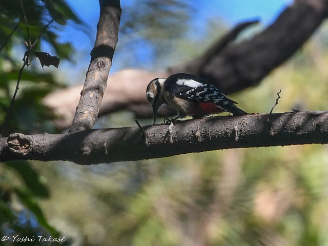 The great spotted woodpecker was moving about branches of trees looking for baits. The woodpecker seemed to have found a worm on a branch. Great spotted woodpecker is a popular woodpecker distributed throughout Europe and northern Asia. It is popular in Japan, too.