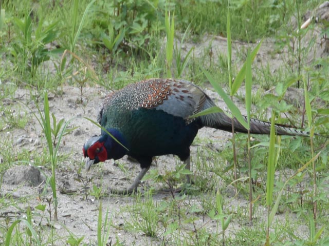 2016年5月3日、我孫子市にある手賀沼公園を散歩した。公園の遊歩道を歩いていると離れた土手にキジがいるのに気付いた。キジは開けた草原を歩きながら餌をさがしているようだ。