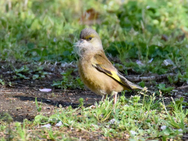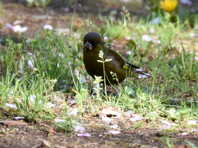 2016年4月15日、柏市にある柏の葉公園を早朝散歩した。散歩道横の草原に2羽のカワラヒワがいた。このカワラヒワの羽毛は濃い緑色だ。カワラヒワのオスとメスだろうか?
