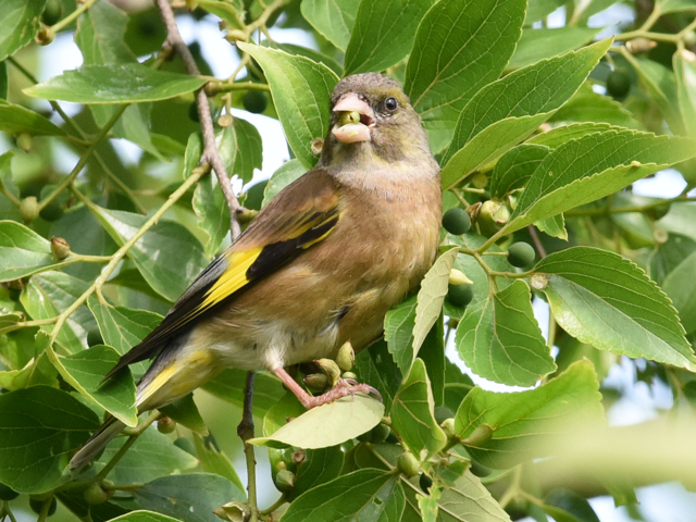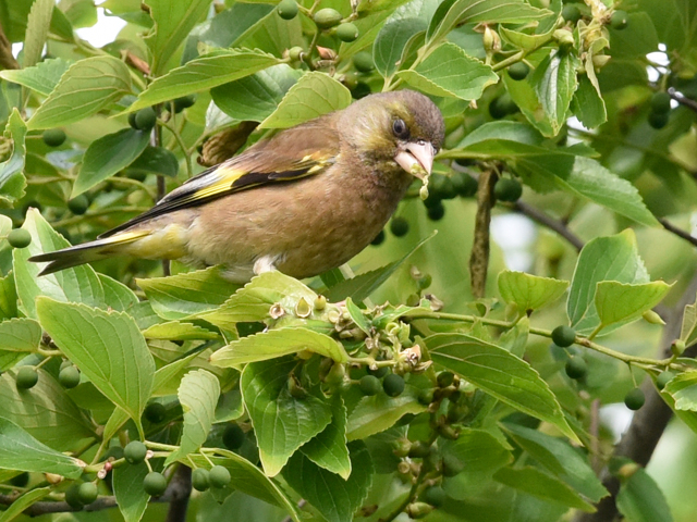 水元公園のカワセミの里周辺にあるエノキにカワラヒワが来て木の実を食べている。