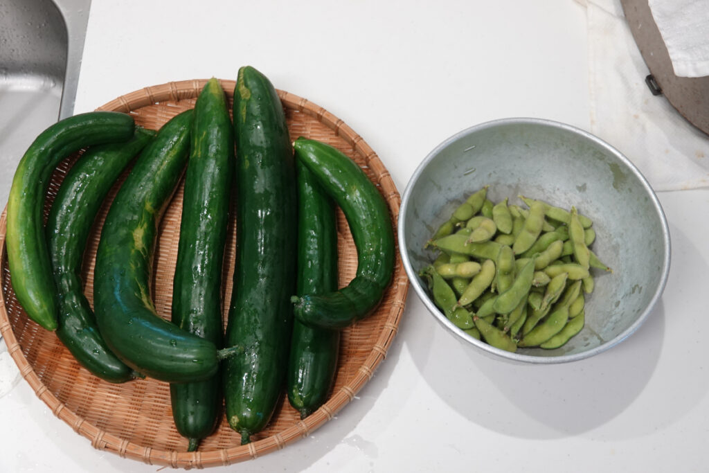 2025年9月28日、今日の収穫野菜、きゅうりが7本もなった。まっすぐに育ったのは3本、あとの4本はかなり曲がっている。エダマメも食べごろになった。エダマメは今年2回目の収穫だ。