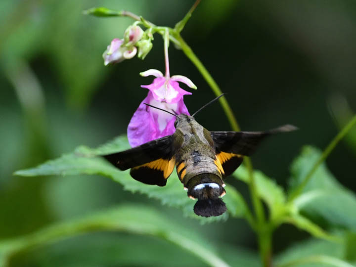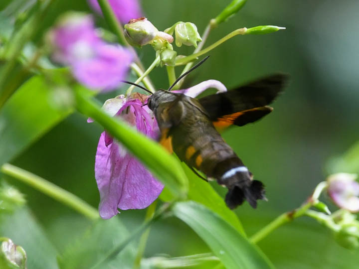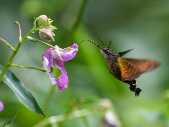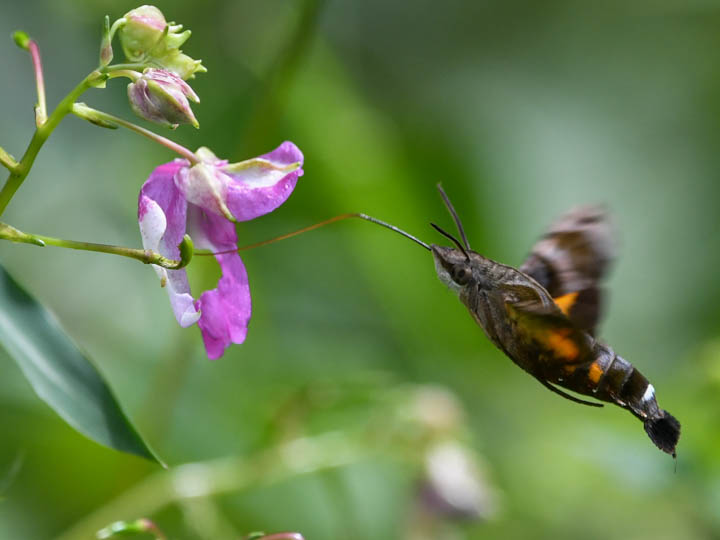 こんぶくろ池自然博物公園にワタラセツリフネソウが群落自生する場所がある。花が咲くとホシホウジャクが吸蜜にやって来る。それを写真に撮るのが楽しい。ホシホウジャクは素早く花から花へ飛び回って吸蜜する。1つの花に1秒もとどまっていない。だから写真を撮るのが難しい。写真を見ると口吻は体と同じくらい長い。だからツリフネソウの花の奥まで届く。長い口吻を使って短時間にどうして蜜を体内に移動できるのか不思議だ。