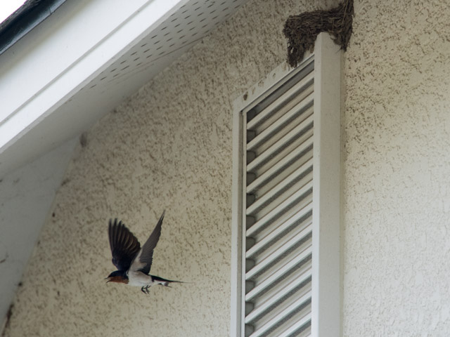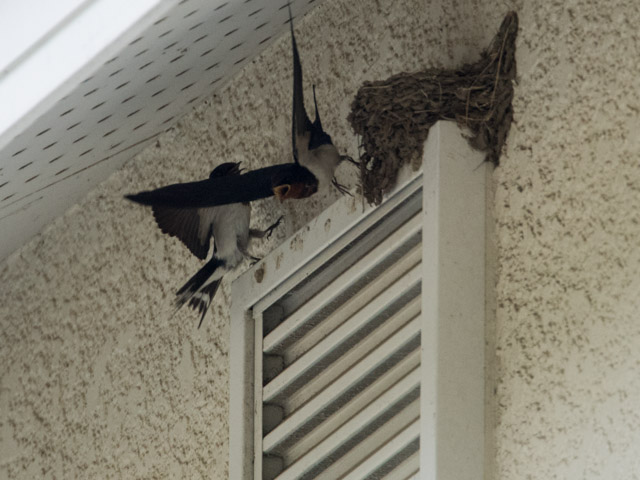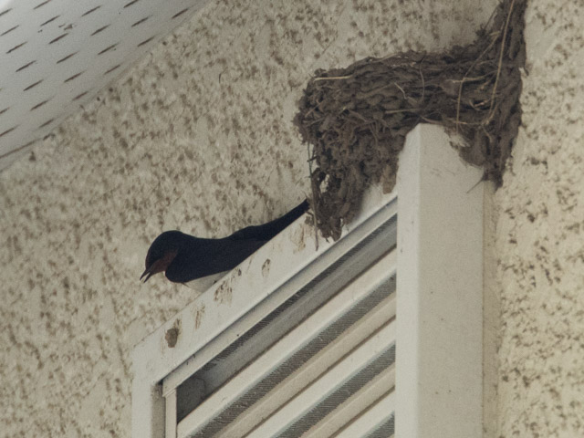 ツバメが民家の軒下の壁に巣を作っていた。A pair of swallows were making a nest on the wall under the roof of a private house.