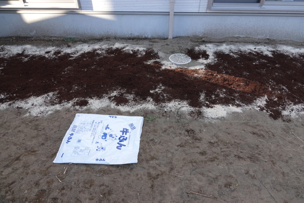 庭園全面に腐葉土を蒔いた。さらに、アルカリ性を中和する目的でピートモスを局所選定して撒いた。