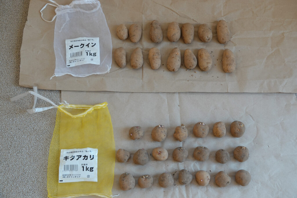 キタアカリとメークインの種芋を各1kg購入し、部屋の中に並べて芽出しをした。