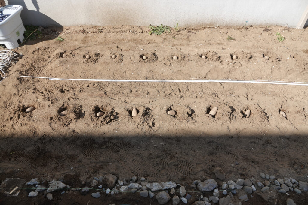 いわゆる逆さ植え、芽が下向きになるように置いた。
