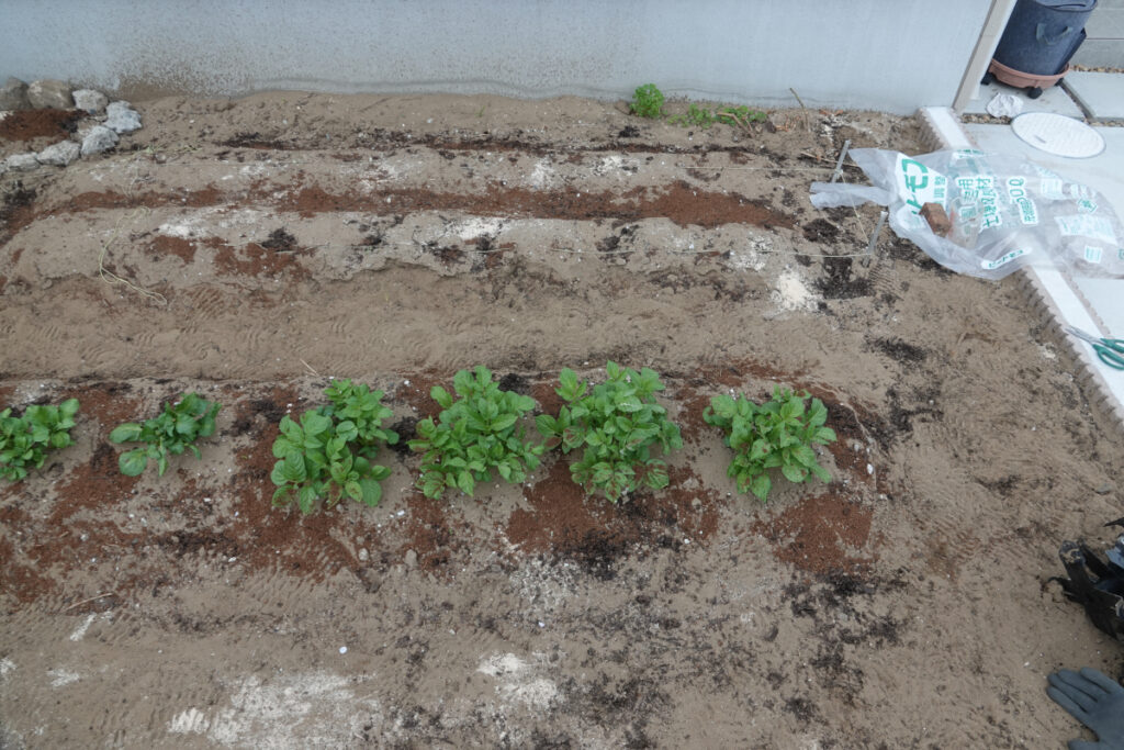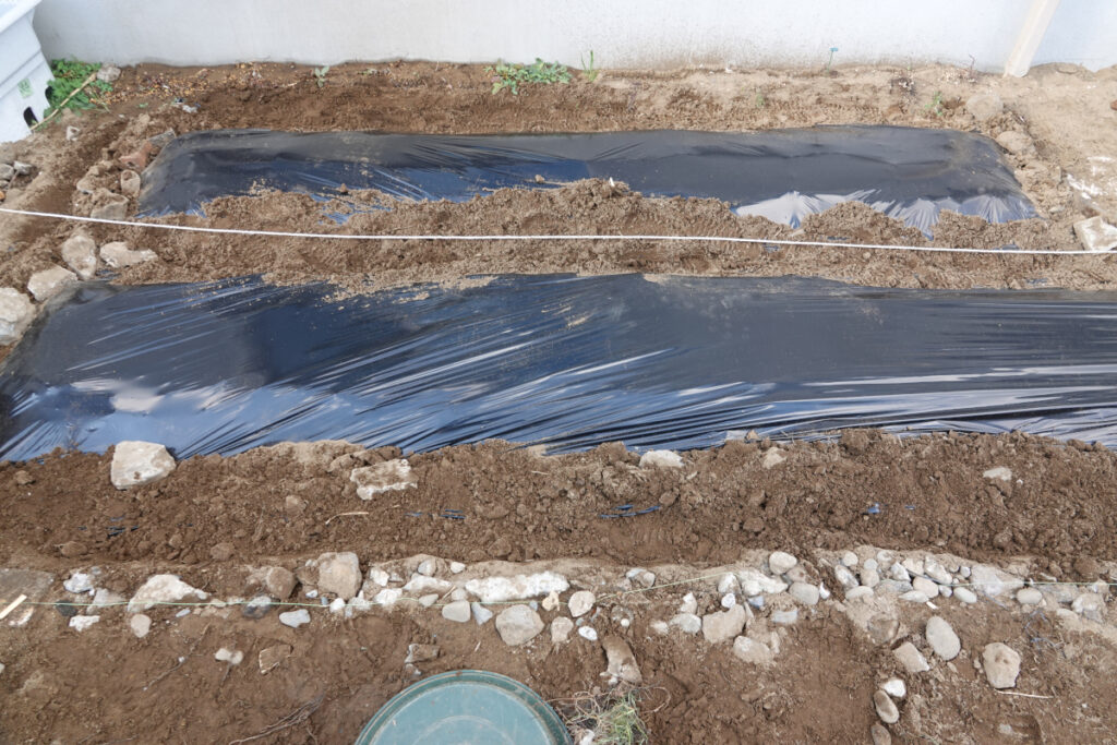 30㎝間隔で植え付け薄く土をかけた。そして植え付けた畝を黒いマルチシートで覆った。