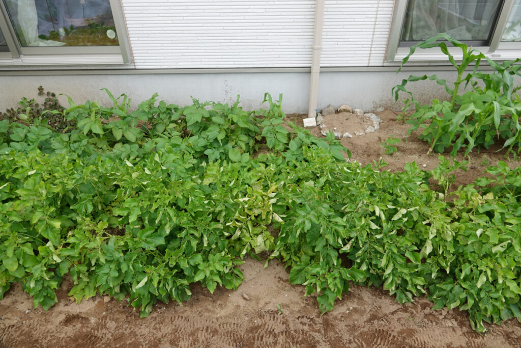 2025年6月2日、ジャガイモの生育の良かったところから葉がやや枯れ始めた。収穫時期が近い印のようだ。