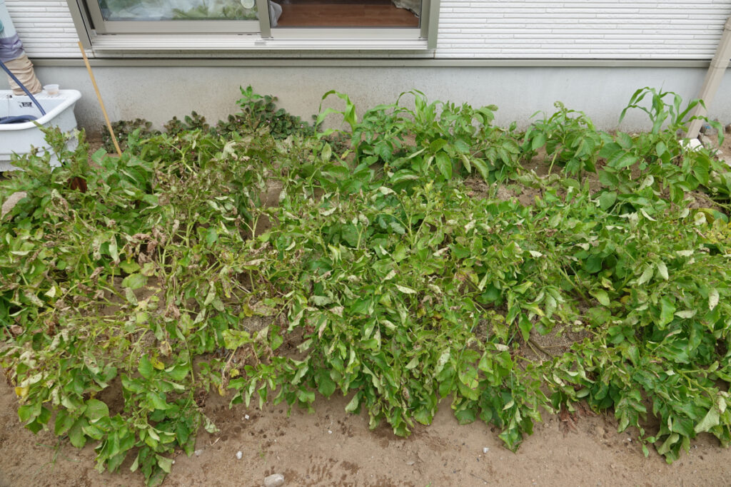 2025年6月8日、ジャガイモを植えてから91日になっていた。梅雨の時期に入るし、収穫することにした。ジャガイモの葉を見るとかなりしおれている。