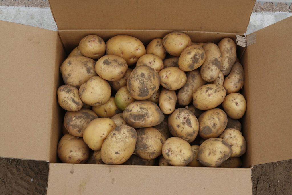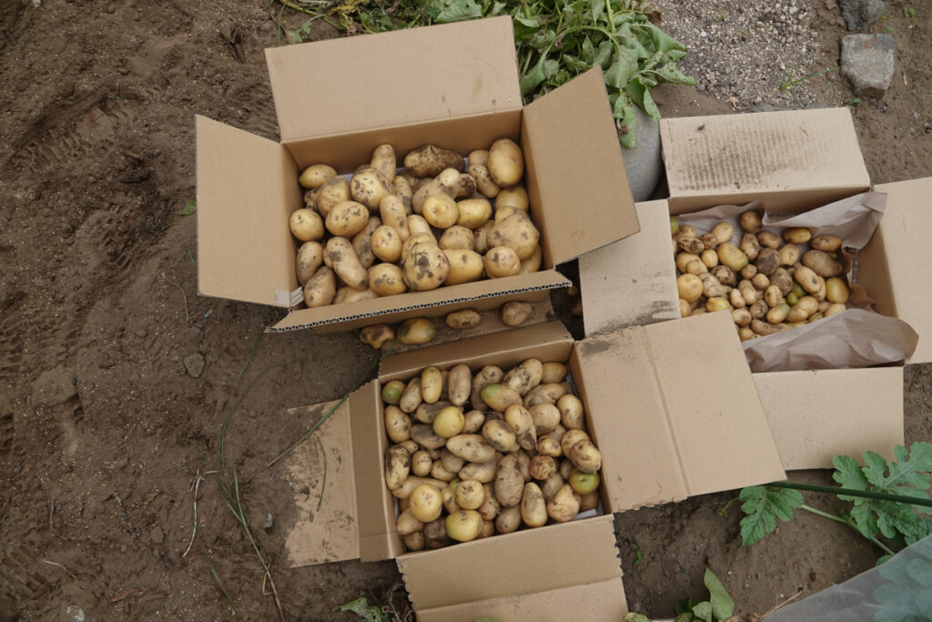 収穫したジャガイモの大きさ別に段ボールの箱に入れた。重さでは、大きいジャガイモ(200g/個前後)が一番だ。大きいジャガイモは段ボール込みで10.3kgありました。中ジャガイモ(100g/個前後)は段ボール込みで5.7kgありました。無農薬の初めての栽培にしては上出来でした。