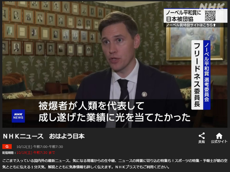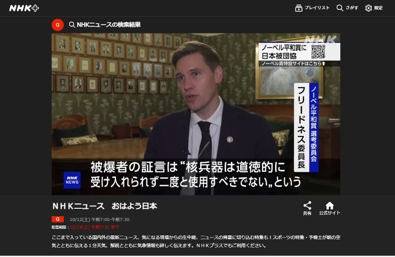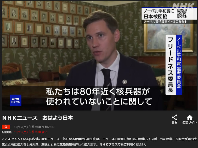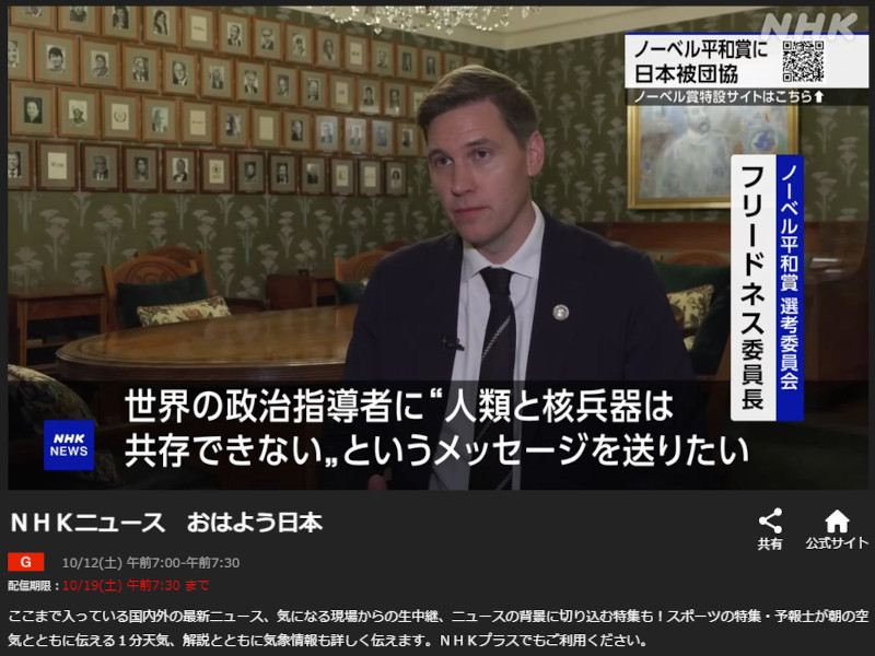 ノーベル平和賞 選考委員会 フリードネス委員長のNHKインタビュー, Nobel Peace Prize Selection Committee Chairman Friedness’ interview with NHK
