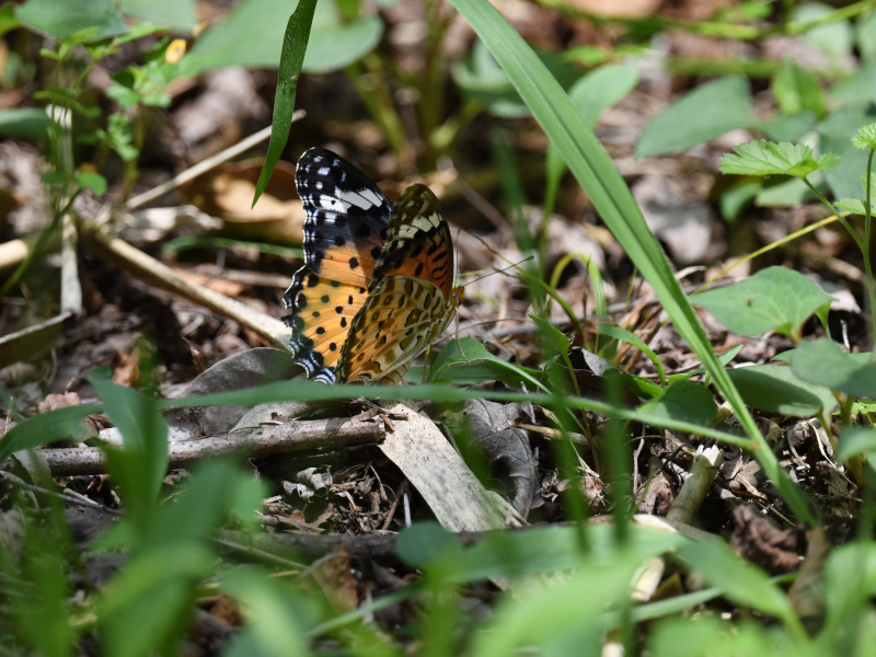 柏の葉第2水辺公園で見た鮮やかで目立つ色合いの翅をもつツマグロヒョウモンのメス。なぜかメスは地面を徘徊しているのを見かける。産卵場所を探しているのかな?