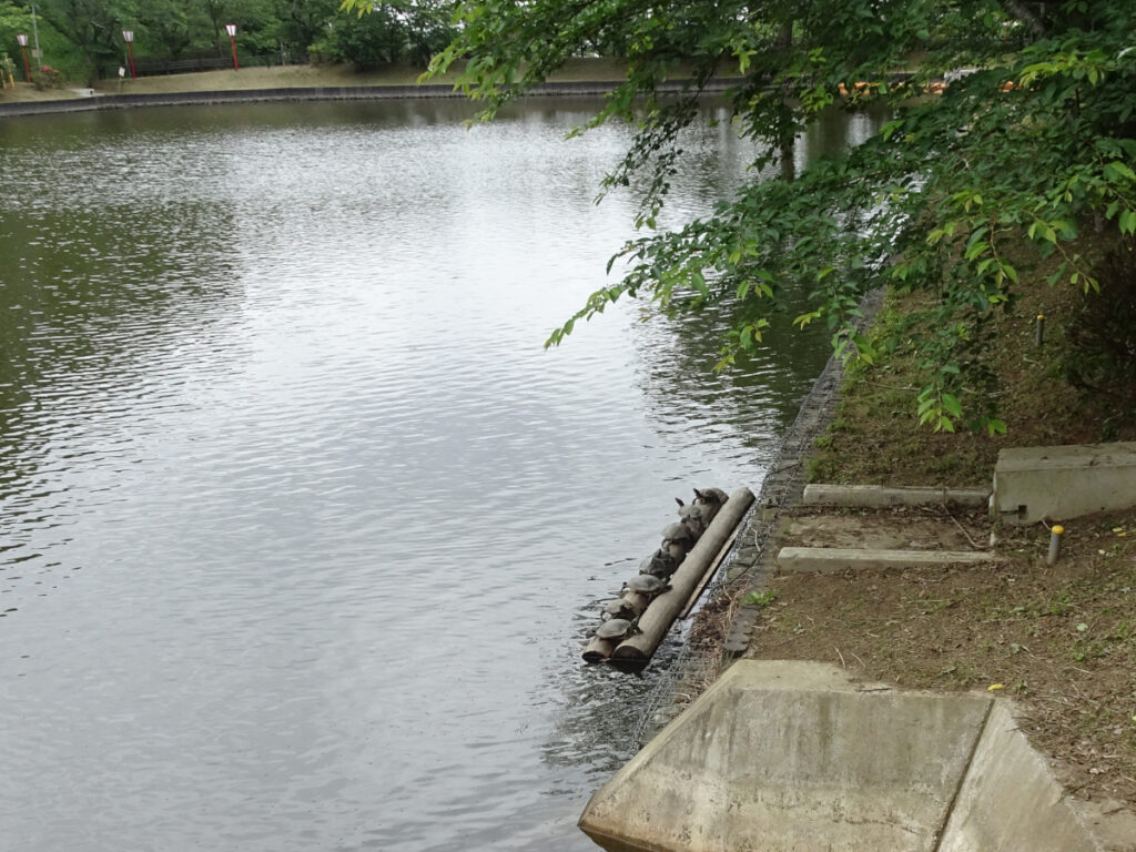 I was surprised to see many turtles sunning themselves, even though there were no waterfowl to be seen. This turtle is a red-eared slider, an invasive species. In 2022, the red-eared slider was designated a “conditionally specified invasive species.” From June 1, 2023, it is prohibited to release it into the wild, import it, sell it, purchase it, distribute it, etc. without permission. It will take a lot of effort and time to restore the current situation where invasive species have proliferated so much to an environment where Japan’s native turtles can live.