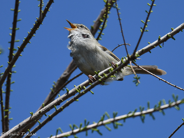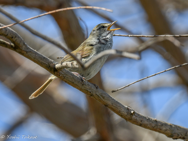 The warbler puffed out the throat and sang the song like “Hooo-hokekyo” two or three times very clearly. The warbler stayed on this twig for several tens of seconds, but flew away soon to another place and was invisible.