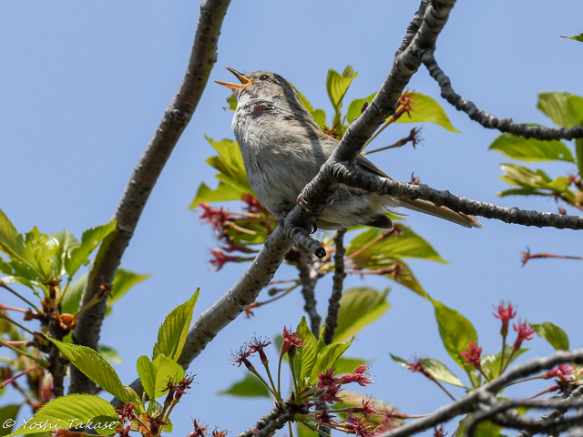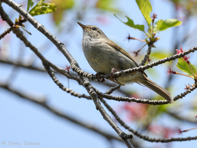 The warbler has moved to a nearby cherry blossom twig. The cherry blossoms have been already scattered. The warbler began singing again on the moved twig. In the same way, it opened the mouth wide and puffed out the throat and sang the song like “Hooo-hokekyo” a few times clearly.