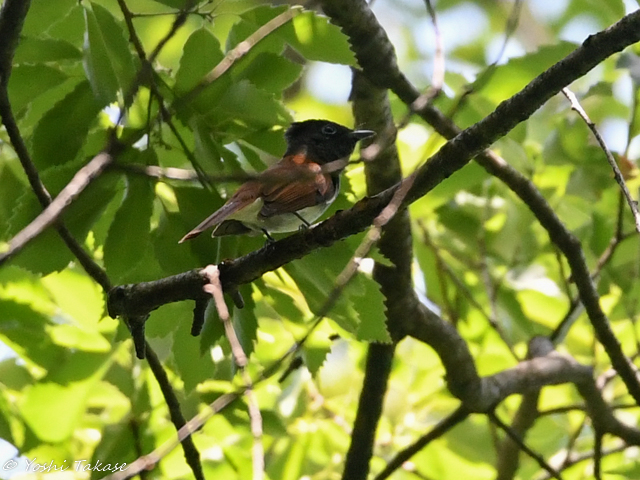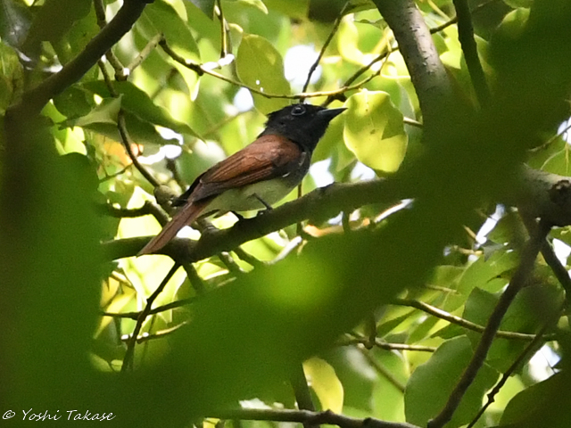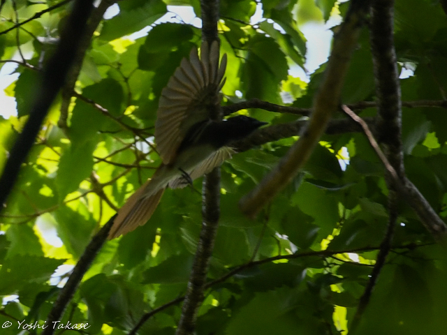 The behavior of this bird flying around branches of trees is interesting, but it was very difficult to take clear pictures as it was often in dark and back light conditions. If the bird perches on the branch where the light leaks, you can see the color of the feather.