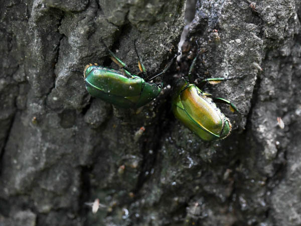 こんぶくろ池自然博物公園には樹液を出しているクヌギの木がある。2021年7月29日に行ってみると、たくさんの昆虫が集まっていた。 カブトムシのオス1頭、メス3頭、カナブン6頭、スズメバチ2頭、後になってルリタテハまでやってきた。2年前までは、樹液を出している クヌギの木が遊歩道近くにもう一本あった。この木は今回の木ほど太くなく凸凹が少なかったので、カブトムシなどの写真を撮るのによかった。 でもその木は身を削って昆虫に奉仕した末、枯れて倒れてしまった。