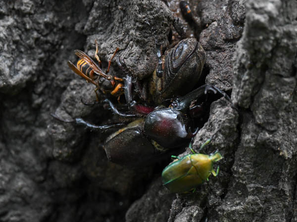 樹液に集まるカブトムシ、カナブン、スズメバチ, Japanese rhinoceros beetles, drone beetles and hornets that gather in the sap.