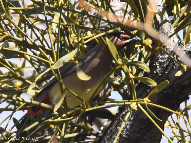 2回目の秋ヶ瀬公園訪問でヒレンジャクを約10分間見ることができた。野鳥園で待っているとヒレンジャクが現れ、メタセコイアの梢に止まった。ヒレンジャクはしばらく高いメタセコイアの梢に止まっていたが、飛んで近くのヤドリギに降りた。ヒレンジャクは嘴で丸いヤドリギの実をつまんだ。