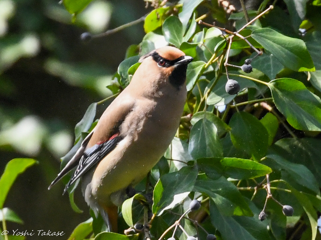 キヅタの果実を食べるヒレンジャク, Japanese waxwing eating the fruit of Japanese ivy.
