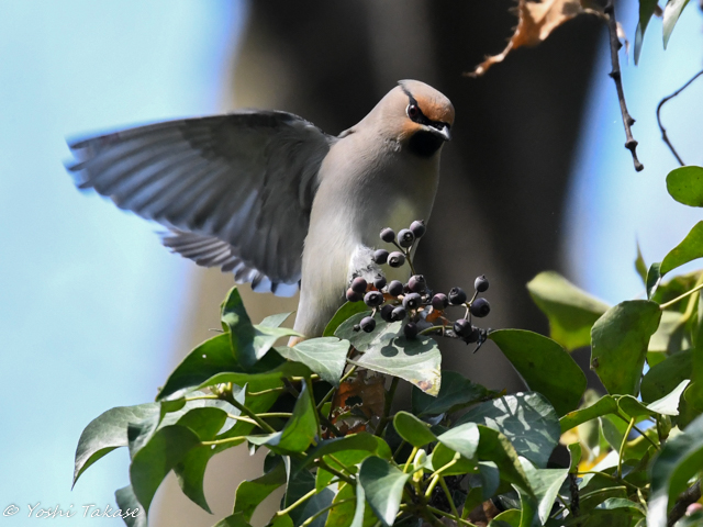 Because the Japanese ivy has plenty of fruits, it seems that several Japanese waxwings were eating ripe fruit while flying around.