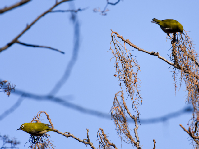 On Jan. 18, 2017, I strolled in Konbukuro-Pond Natural History Park. Two Japanese white-eyes flew near and perched on the branch of the tree around the small grassy plain.