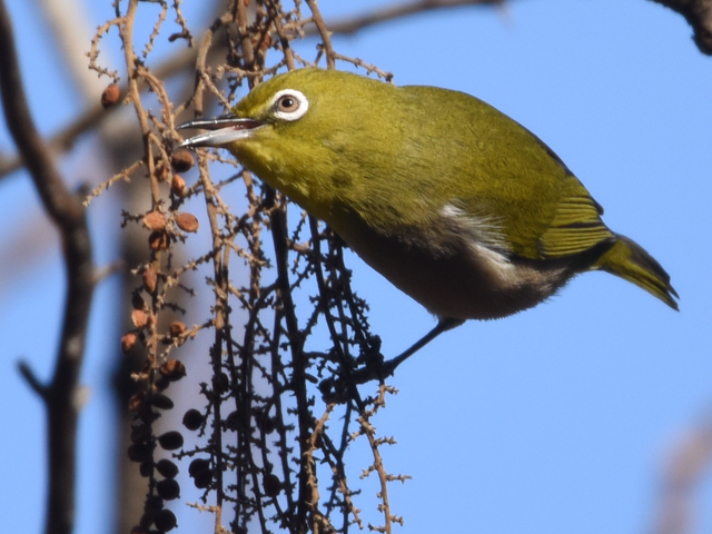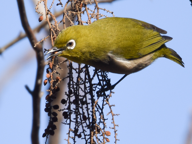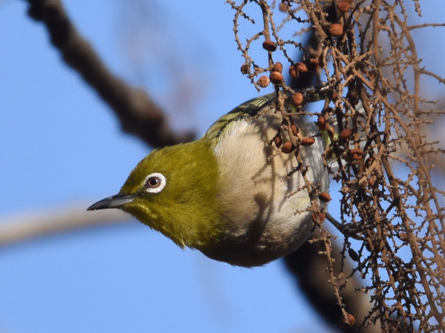 There were still many dry nuts on the tree. The tree will be the Chinese sumac. The Japanese white-eye started eating them. The white-eye seemed to swallow the dry nut as it is. Because it is winter, there are few other foods. I felt a wild taste of the white-eye which was quite different from the image of sweet tooth gathering in flowers.