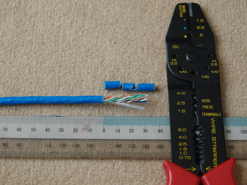 サンワダイレクトLANケーブルCAT6Aは単線仕様であり、割合硬い。Wire Stripperで外皮を取ってみた。このWire Stripperの最大線直径は6mm、きつく挟むと芯線に傷をつけるので、カッターを使ってみた。カッターで外皮に3、4cmの位置に傷を付け、数回折り曲げると割けて簡単に外皮を除くことが出来た。