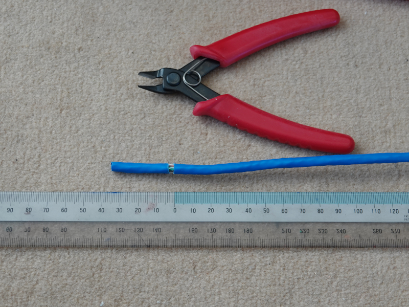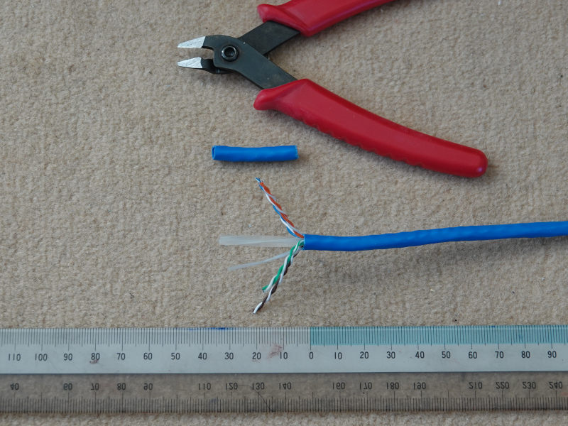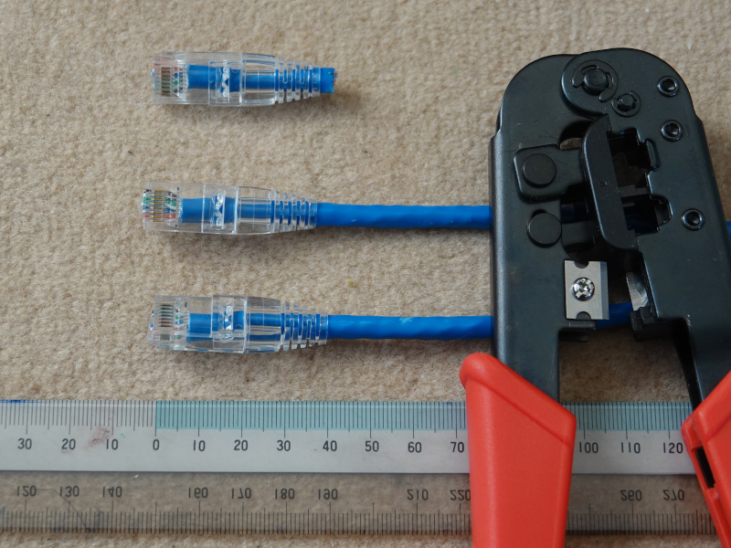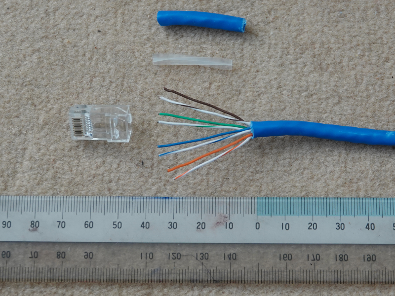 LANケーブルの両端にブーツ付きRJ-45コネクタを付けた。最初、芯線の順序を間違ったので切断しやり直しました。良く見えなかったので3(白青)、5(白緑)と隣りあわせでペアになるようにしてしまっていました。
