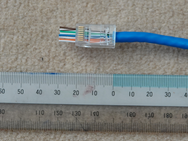 4ペアの芯線を広げると中心部のT字フィラーが出るので、根元からカッターで切除する。芯線の撚りを戻しできるだけ直線状にする。先端は曲がっていることが多いのでカッターで切除し、ブーツと貫通型RJ-45コネクタに通す。各芯線の順序はへの字ラッチの付かない面から見て左から1(白橙),2(橙),3(白緑),4(青),5(白青),6(緑),7(白茶),8(茶)になるように通す。余分の出た線を強く引っ張り撚りの部分を長くする。カッターで余分の出た線を切り取る。切り取り後、線を少し戻し、はみ出しを無くする。かしめ工具でしっかりかしめる。