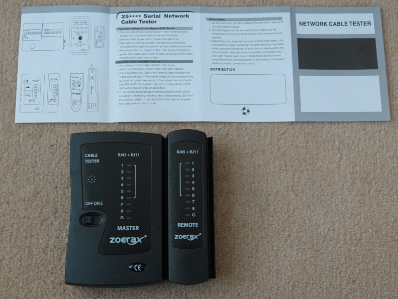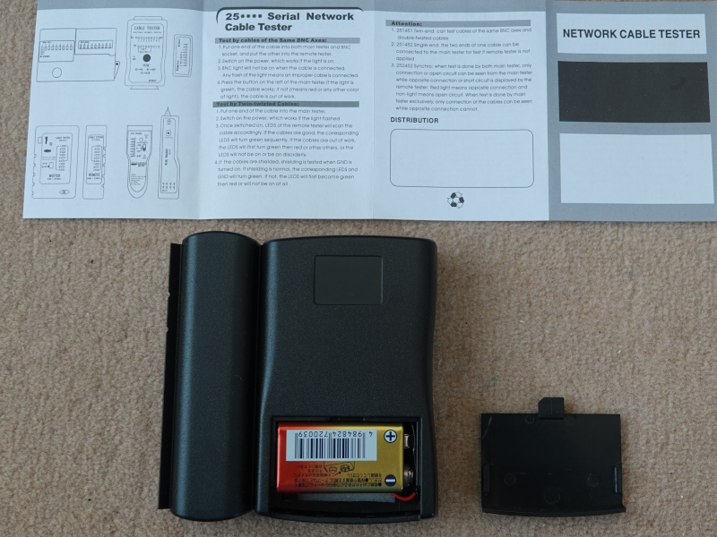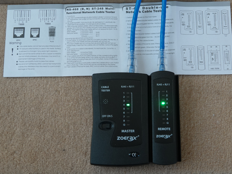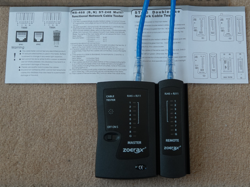 LANケーブルが正常に接続されているか、LANケーブルテスターで 結線・断線チェックを行う。8本の線があるので、このテスターがないとチェックは大変です。LANケーブルテスターは9V積層電池を使っているので別途購入する必要があります。電源を入れると1, 2, …, 8の順にLEDが点灯して結線・断線チェックを行えます。