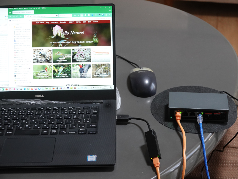 ルーターXG-100NE、制作したLANケーブル、FOXNEO 2.5gbpsスイッチングハブ、USB-LAN変換アダプター、Note PCを接続しインターネットにアクセスしてみた。